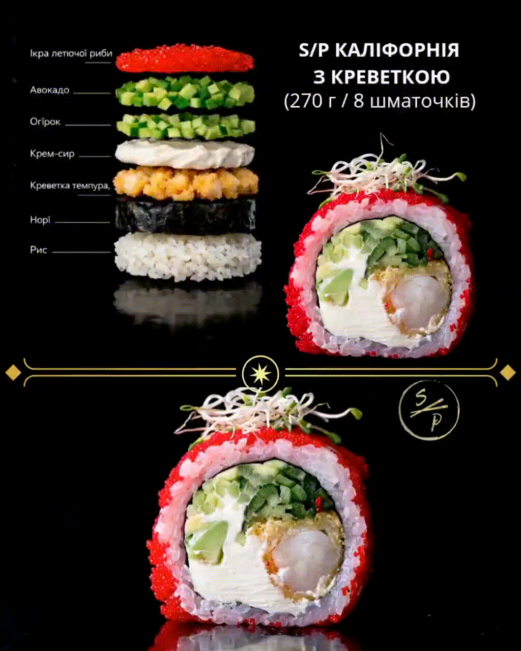 Калифорния с креветкой: Сочная креветка темпура вместе с кремовым сыром, авокадо и огурцом создают невероятную комбинацию вкусов. Икра летучей рыбы придает этому ролу изящной роскоши.