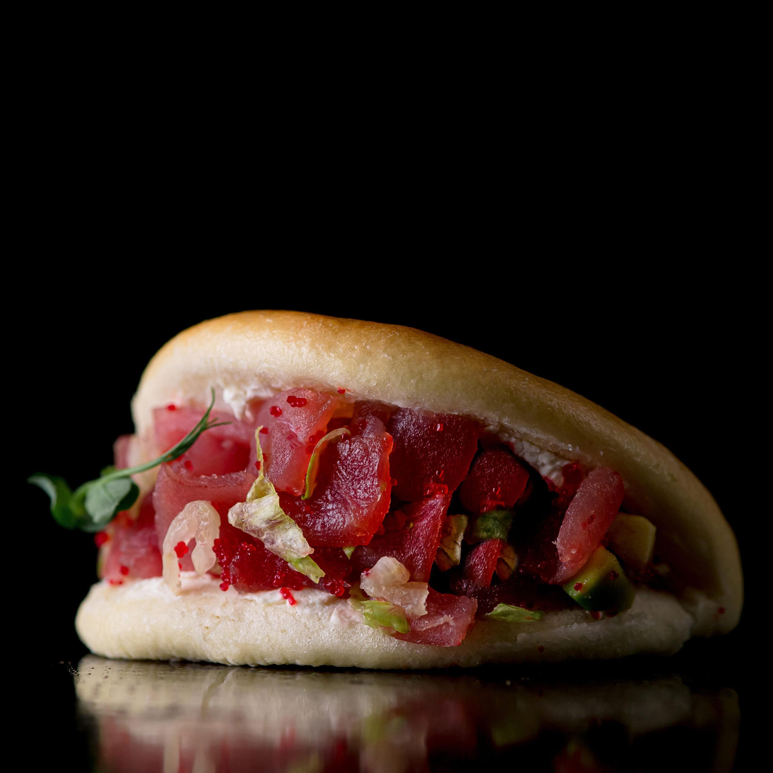 Булочка бао, тунец, ікра летючої риби, крем-сир, авокадо, айсберг, мікрогрін, соус медово-гірчичний.